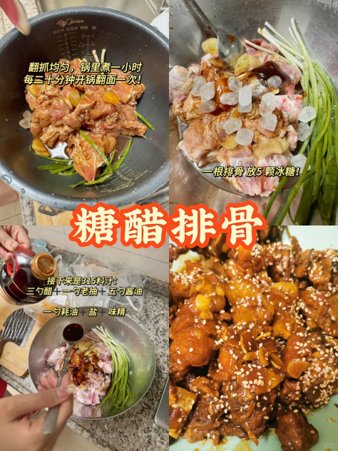 洗干净排骨,配上葱姜配料和生抽、老抽、冰糖等调味料,放入电饭煲按煮饭键煮一小时,中间定期搅拌翻面防止粘锅。一锅无烟火、省油版的糖醋排骨就诞生了。