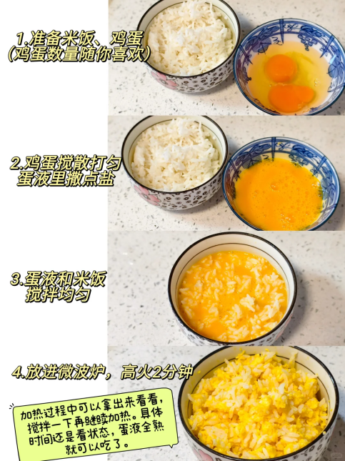 剩下的白米饭+蛋液(撒点盐和胡椒粉),将二者搅匀,放微波炉里高火加热2分钟左右就能开吃了。