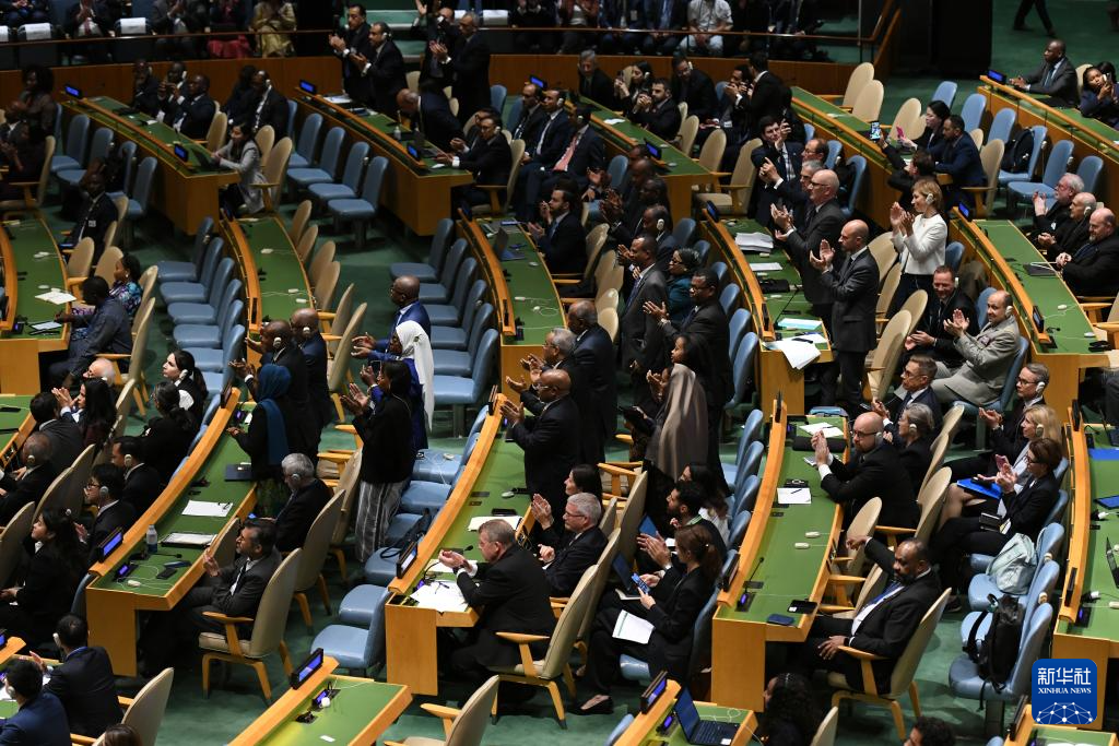 9月22日,在位于纽约的联合国总部举行的和平解决巴勒斯坦问题和落实“两国方案”高级别国际会议上,巴勒斯坦代表为与会领导人发言鼓掌。新华社记者 李睿 摄