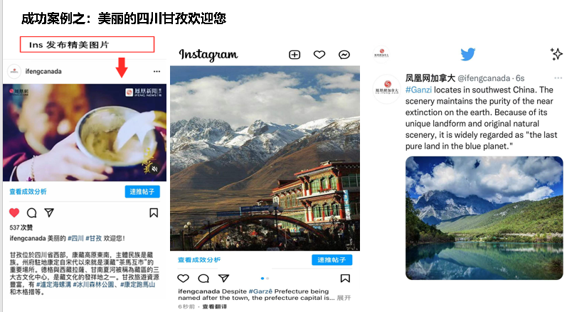 “美丽的四川甘孜”全球推广:通过YouTube、Facebook、Twitter等多平台联动,视频播放量破十万,推文触达几十余万海外华人和用户,成功提升地域文化国际知名度。