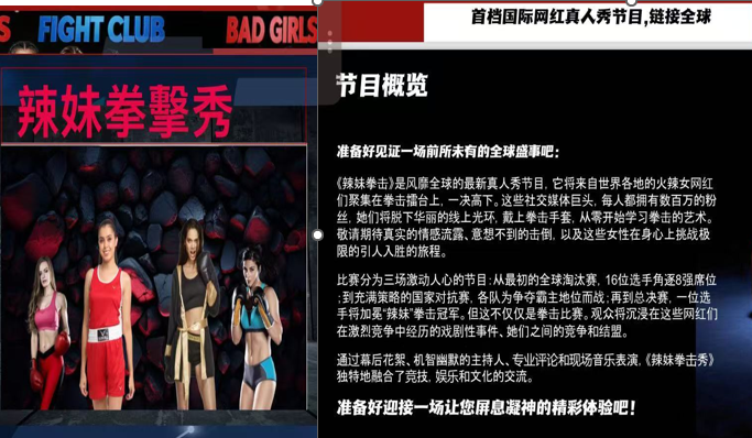 引入英国首档国际网红拳击真人秀,集结16国顶级女性网红,通过“全球淘汰赛-国家对抗赛-冠军战”三阶段赛制,打造文化碰撞与女性励志IP。