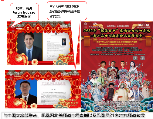 海外华人戏曲春晚:连续在2022-2024年联合文旅部及当地华人组织,在中国的春节举办海外华人的戏曲春晚;已经汇聚了十几位国内戏曲梅花奖得主、10余种戏曲门类,每一次都获得加拿大总理贺信、中国驻多伦多总领事馆高度认可,全网直播覆盖海外华人观众超百万,成为海外华人文化盛事。