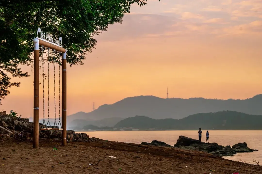 江水激荡时光,人们习惯了在树下,一坐就是小半日,秋千荡起来时,燥热烦忧都被江风带走。