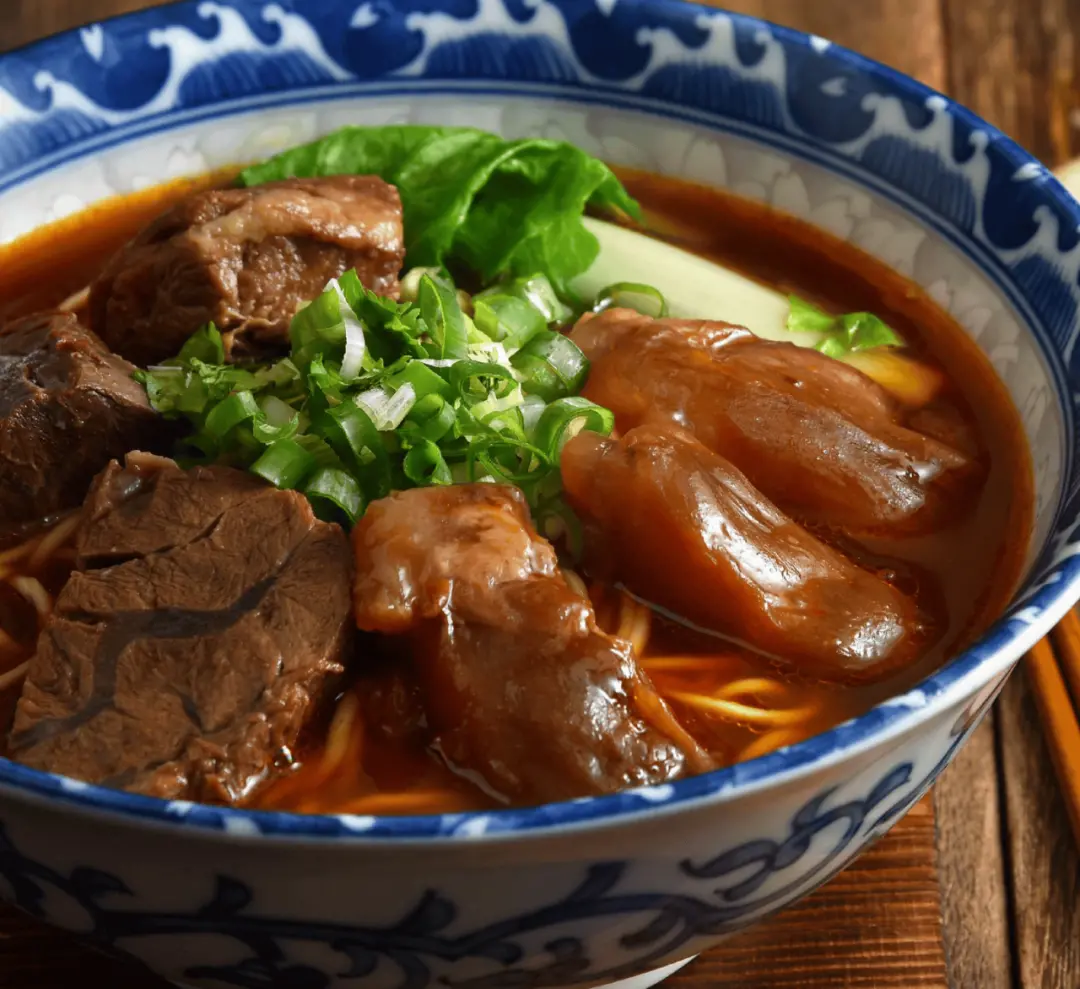 其中最脍炙人口的发明,莫过于“台湾牛肉面”。牛腱或牛腩切块汆烫,以郫县豆瓣酱、八角、桂皮、花椒、姜片、葱段与酱油炒香,加水慢炖三小时以上;面条则多用美援面粉制成的手擀面,筋道有嚼劲。汤头浓郁,牛肉软烂,配上酸菜与青蒜,一口下去,五味俱全。