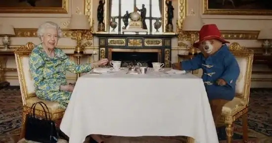 在伊丽莎白二世登基70周年的纪念短片中,帕丁顿熊与她共饮下午茶。