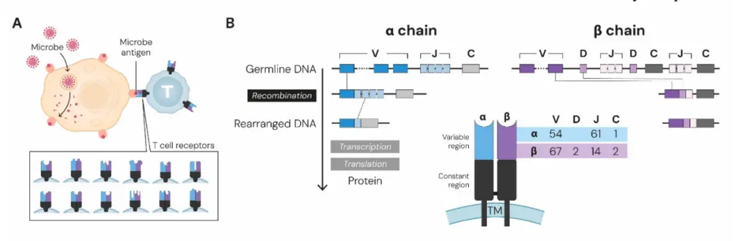 随后,多伦多大学的 Tak Mak 与 斯坦福大学的 Mark Davis 团队发现,T 细胞受体(TCR)同样由 V、D、J 基因片段重组形成,每个人体内理论上可生成 10^15 种不同的 TCR。TCR 主要由 α 链与 β 链(αβ T 细胞)或 γ 链与 δ 链(γδ T 细胞)组成,其中大多数 T 细胞属于 αβ 型,包括本年度诺奖核心的调节性 T 细胞(Treg)。