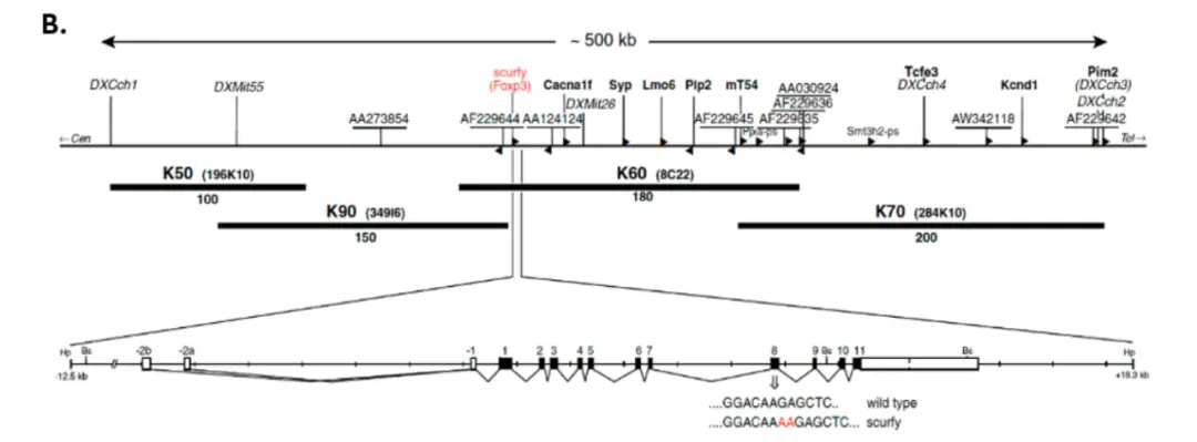 仅在检查最后一个基因时,Brunkow 和 Ramsdell 才鉴定出一个导致移码和提前终止密码子的两碱基对插入。这一基因先前未被描述,且在当时可用的数据库中不存在。由于它与其他叉头/翼状螺旋结构域基因具有同源性,Brunkow 和 Ramsdell 将基因命名为 Forkhead box P3(Foxp3)。