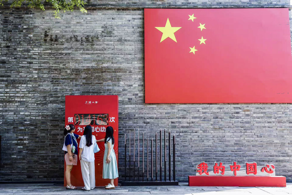 10月1日,在浙江嘉兴市南湖区建设街道子城城墙边,市民参加我为祖国心动打卡活动。新华社记者徐昱摄