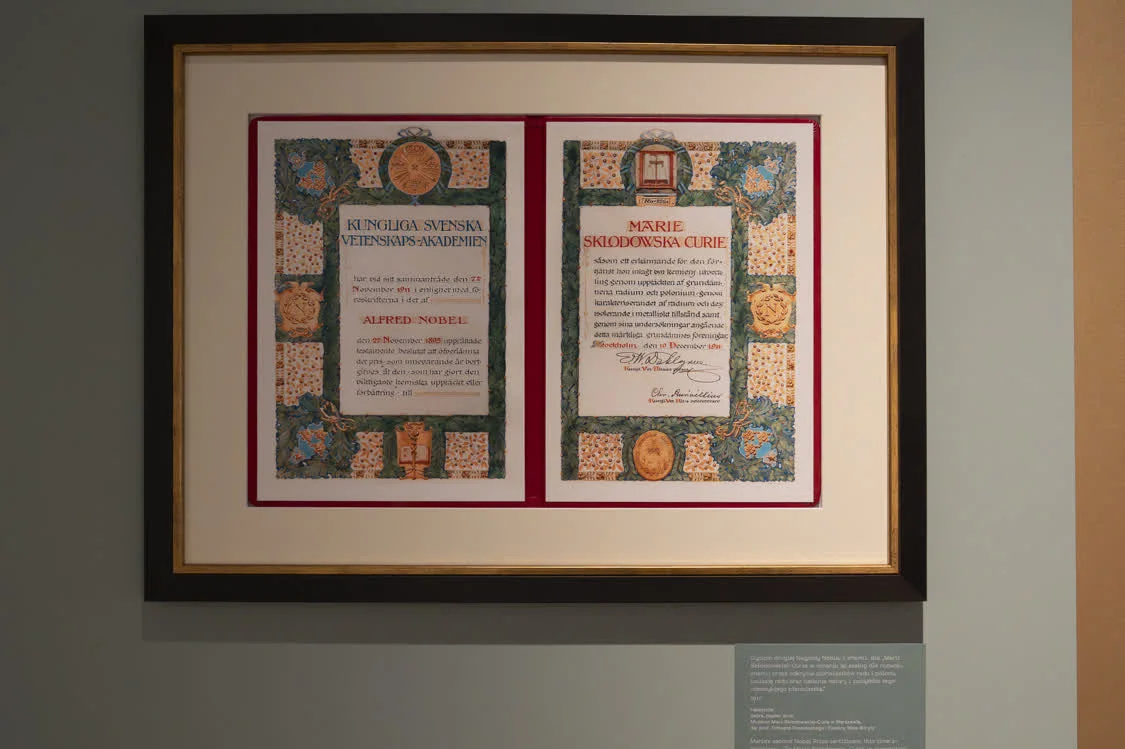 这是10月7日在波兰华沙的玛丽·斯克洛多夫斯卡-居里博物馆拍摄的居里夫人1911年获得诺贝尔化学奖的证书复制品。新华社记者 夏原一 摄