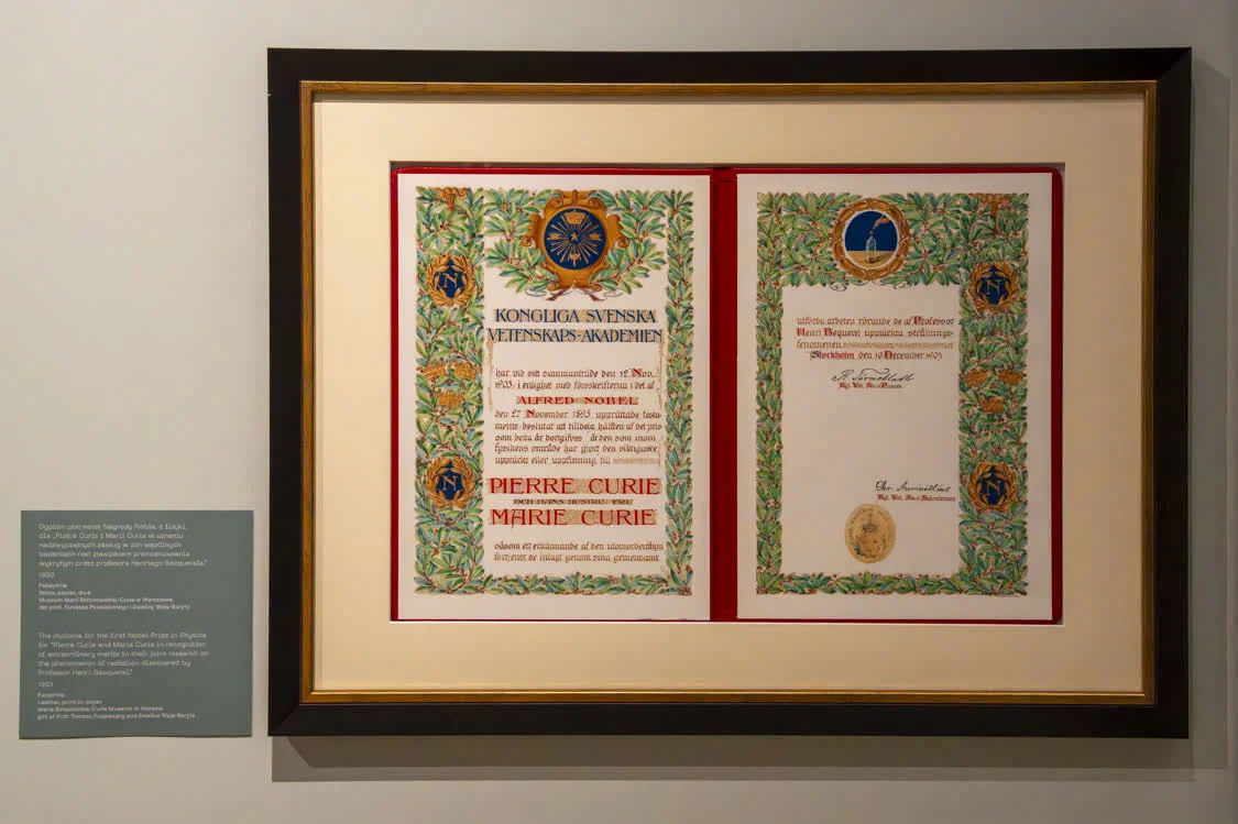 这是10月7日在波兰华沙的玛丽·斯克洛多夫斯卡-居里博物馆拍摄的居里夫妇1903年获得诺贝尔物理学奖的证书复制品。新华社记者 夏原一 摄