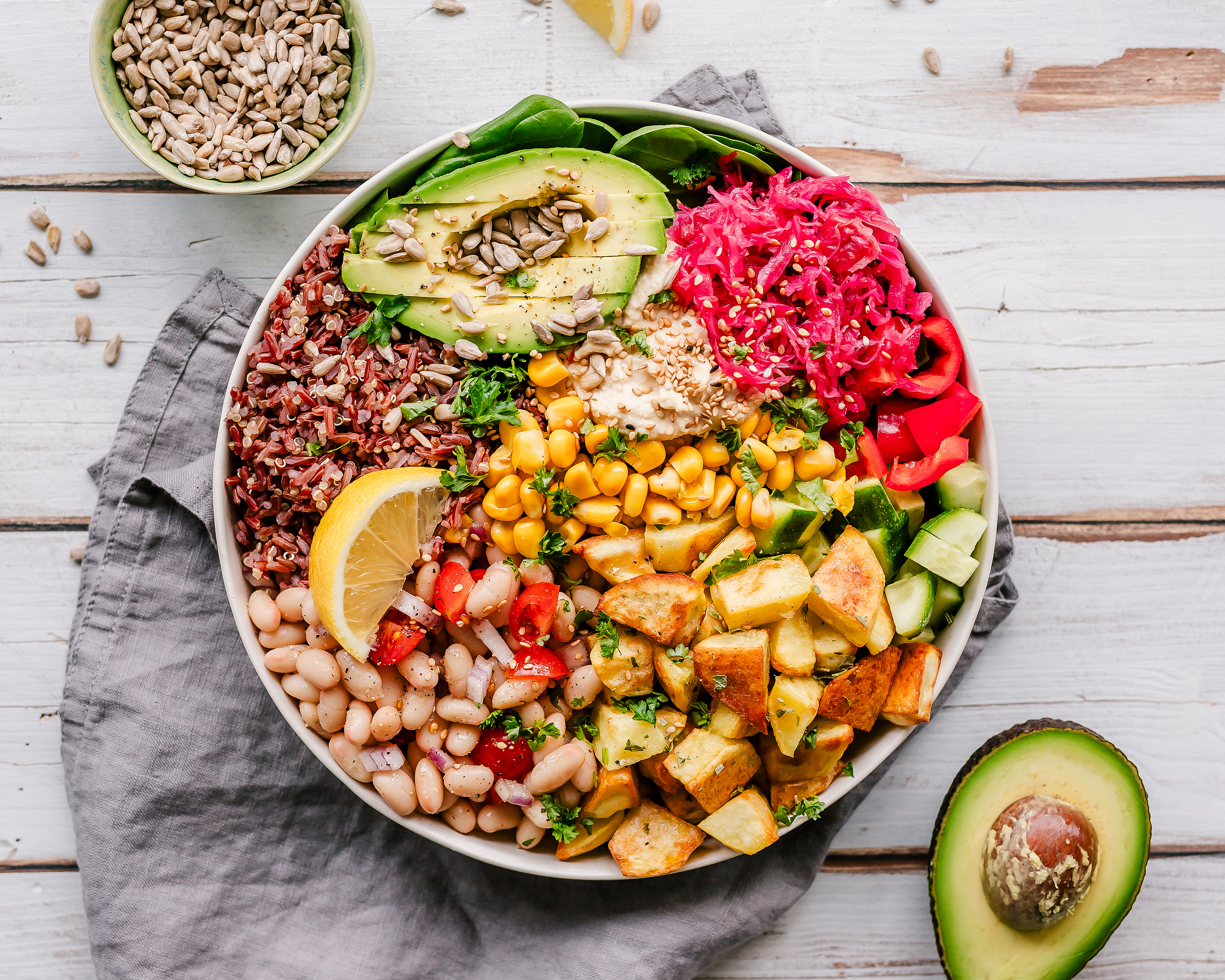 一口吃进整个彩虹是什么体验,蔬果沙拉告诉你答案。提前用生菜紫甘蓝打底,搭配牛油果、玉米粒、小番茄和坚果碎,淋橄榄油醋汁即可。富含维生素和膳食纤维,帮助清除血管杂质,促进肠道健康。