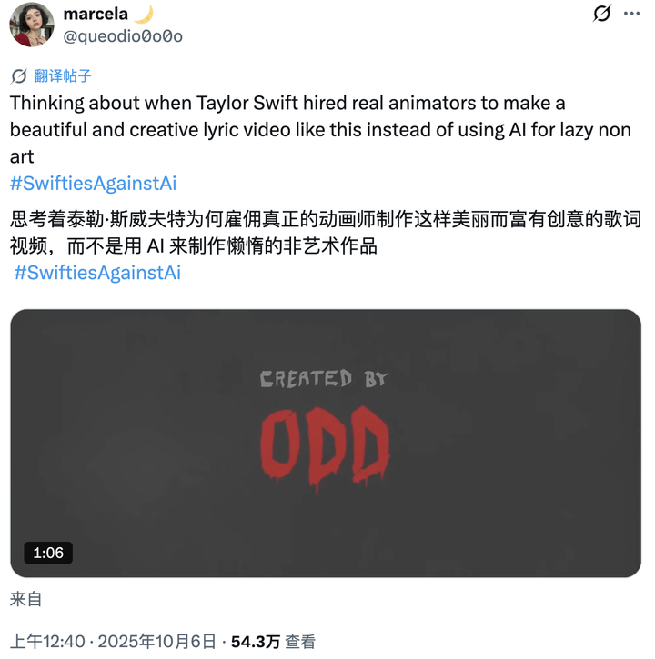 正因如此,当粉丝们在社交媒体上高举 #SwiftiesAgainstAI 的旗帜, 也是在用他们的方式告诉世界: 艺术的价值, 源于创作者灵魂的在场,而人类还没准备好生活在一个 AI 主导的世界里。