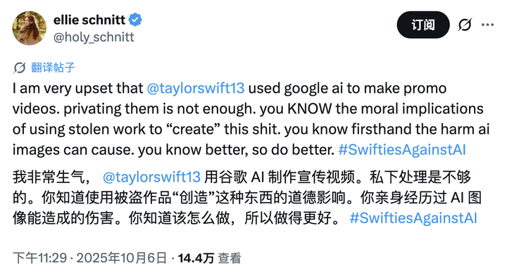 伴随着相关报道的不断涌现,X 和 TikTok 等海外平台上掀起了话题 #SwiftiesAgainstAI,粉丝们不仅针对 AI 技术本身, 更指向一种对偶像的背叛感。