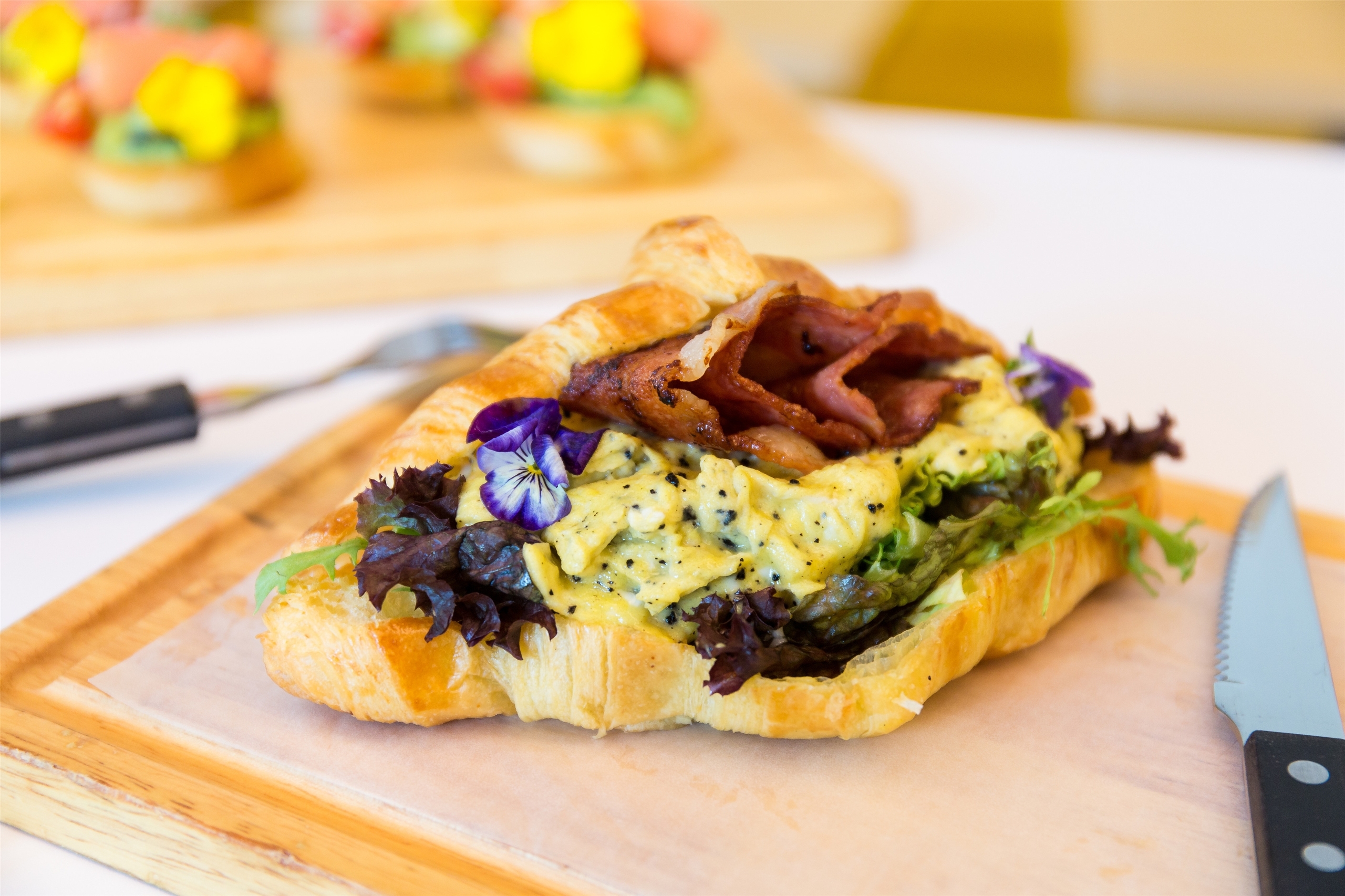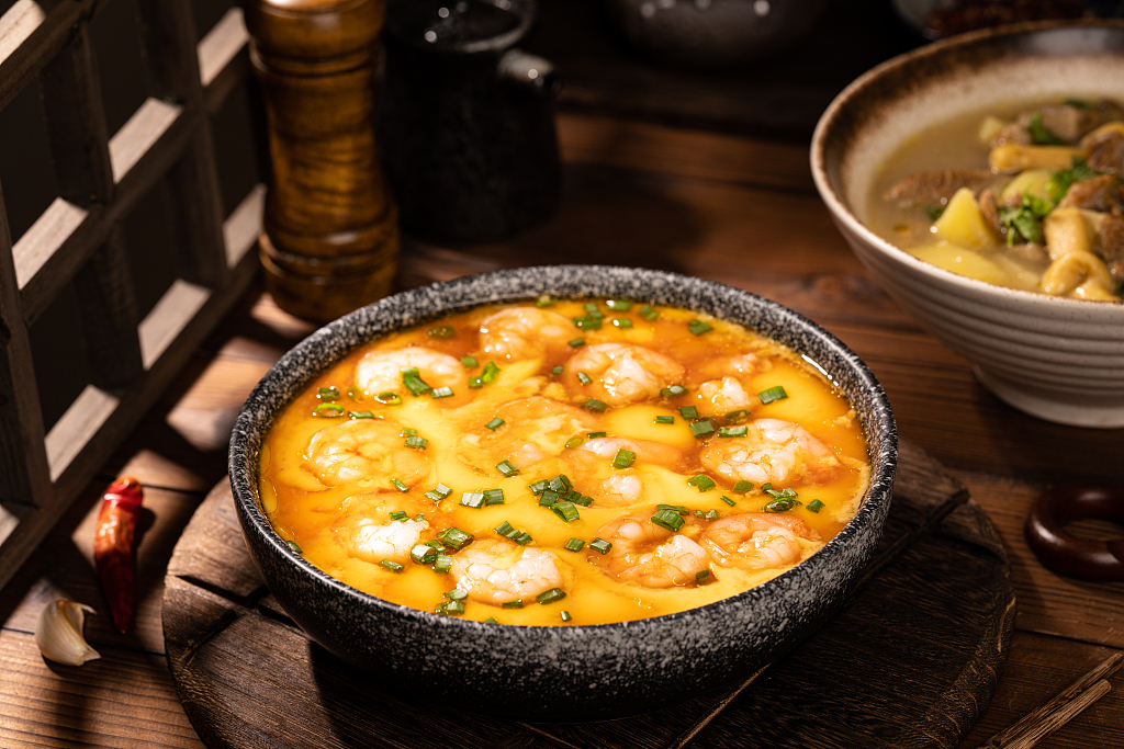 跟着大厨一起学做虾仁,你就解锁了这款米其林同款!鸡蛋加少许牛奶打散,虾仁提前用盐腌过,热油先滑熟虾仁盛在牛角酥里进烤箱烤3分钟,最后加入煎香的培根和黑松露碎。