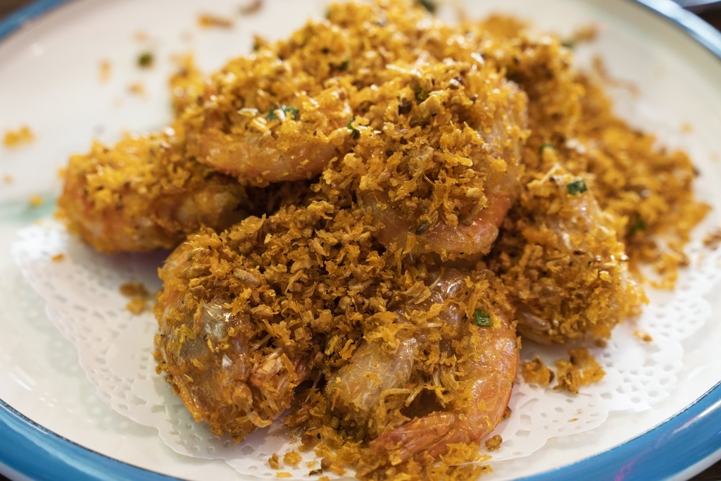 深夜大排档老牌儿的避风塘炒虾仁,鲜香酥脆,蒜香味十足,虾仁提前裹上薄淀粉炸到金黄,爆香蒜末和辣椒,加面包糠炒到金黄,最后倒虾仁翻拌,好吃到连壳带肉全部吃光光。