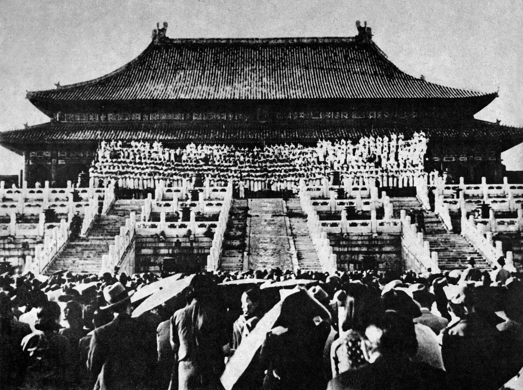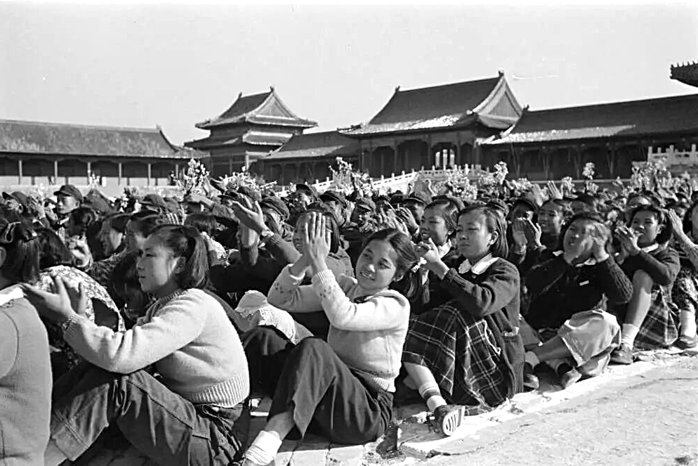 1935年,拥有600多名男女团员的北平大中学生联合歌咏团在故宫太和殿表演大合唱盛况。