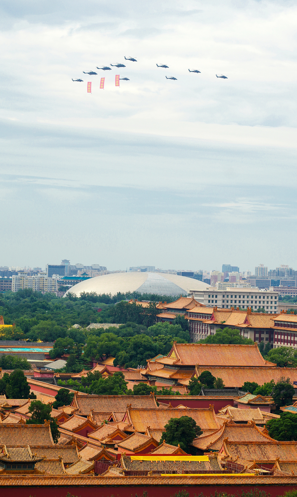 2025年8月24日,北京,纪念中国人民抗日战争暨世界反法西斯战争胜利80周年阅兵进行第三次彩排,空中梯队飞越故宫上空。