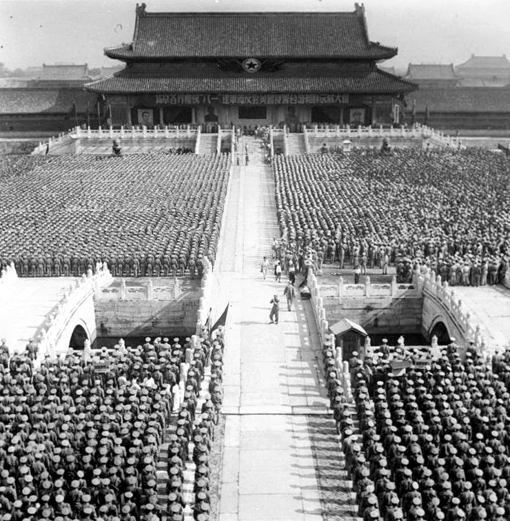1950年8月1日,故宫太和门广场上人山人海,海、陆、空部队和首都各界4万多人聚集于此,庆祝新中国成立后的第一个建军节。中国军网 图