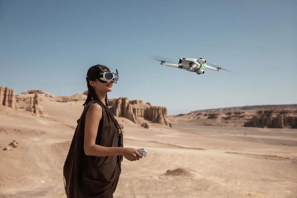 影石影翎Antigravity并非首家在无人机上安装360度相机的公司,但自称是首个从一开始就围绕此类相机设计无人机的品牌。A1随附一副头部追踪眼镜和一个经重新设计可单手使用的控制器。这意味着飞手可以获得他们喜欢的任意方向的无人机视角,创造更沉浸的体验。由于A1仅重249克,美国及大多数其他市场的买家无需持有无人机操作执照即可飞行。