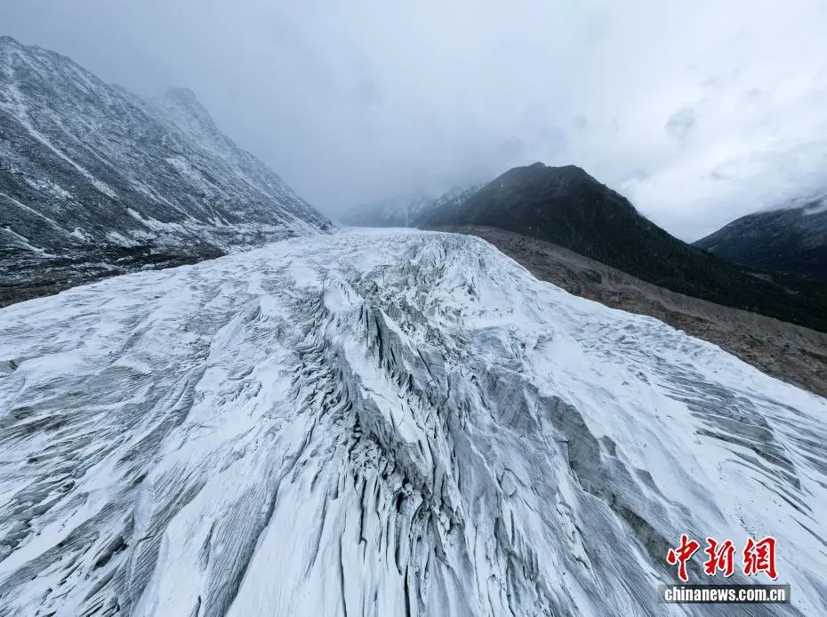 西藏依嘎冰川位于那曲市嘉黎县尼屋乡依嘎村,地处东念青唐古拉山脉深处,是那曲与林芝的交界地带。据悉,依嘎冰川主峰海拔6600米,冰舌末端海拔约4000米,落差达2600米。近日,中新网记者自驾途经依嘎冰川看到,周边山势陡峭、险峻,植被丰富,此外该冰川还拥有冰瀑布以及清晰的冰川纹路等,十分壮阔。图为10月17日,依嘎冰川的冰川纹路。江飞波 摄