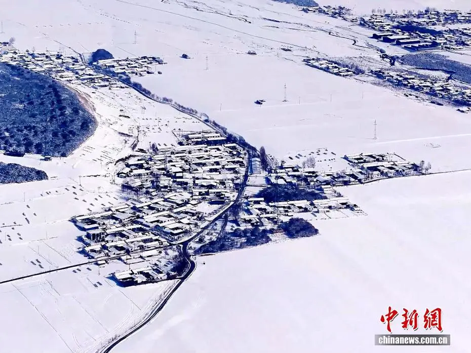 高原深秋,位于祁连山青海片区的青海省海北州门源回族自治县、祁连县等地迎来首场降雪。初雪过后的祁连山下浩门河清冽蜿蜒,岗什卡雪峰巍峨延绵,村庄、田野和山川披上了一层银白的薄纱,构成了一幅美妙的画卷。图为村庄在白雪覆盖下显得格外静谧。马思琦 摄