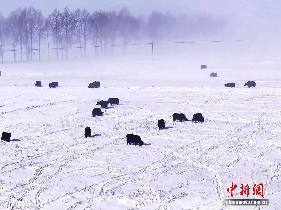 高原深秋,位于祁连山青海片区的青海省海北州门源回族自治县、祁连县等地迎来首场降雪。初雪过后的祁连山下浩门河清冽蜿蜒,岗什卡雪峰巍峨延绵,村庄、田野和山川披上了一层银白的薄纱,构成了一幅美妙的画卷。图为牛羊在雪中觅食。马思琦 摄