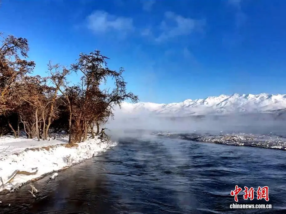 高原深秋,位于祁连山青海片区的青海省海北州门源回族自治县、祁连县等地迎来首场降雪。初雪过后的祁连山下浩门河清冽蜿蜒,岗什卡雪峰巍峨延绵,村庄、田野和山川披上了一层银白的薄纱,构成了一幅美妙的画卷。图为浩门河水面上升起的水汽。马思琦 摄