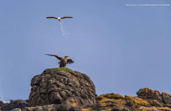 摄影师Warren Price写道:这些海鸦在一个狭小的岩石悬崖壁架上筑巢,巢穴都挤在一起,空间非常紧张。然而,它们有强烈的领地意识,为了争夺空间,攻击和斗争频繁发生。摄影师很喜欢海鸦直视镜头的样子——白色的“眼线”显得它一脸困惑又无辜,而它的邻居正想一口咬掉它的头!