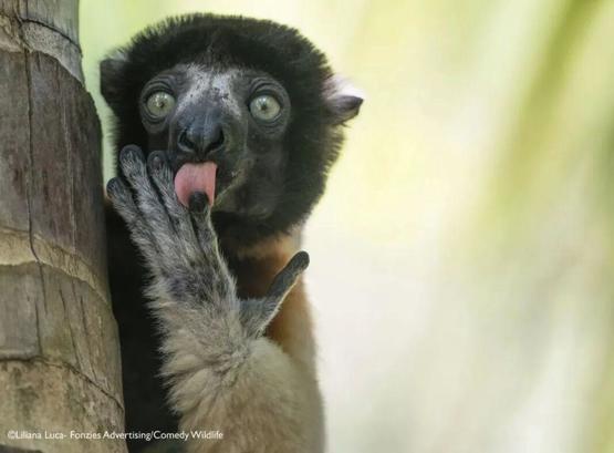 这种狐猴是当地特有的灵长类动物,以优雅的跳跃姿态闻名。摄影师写道:“就在那时,它出现了,用又大又好奇的眼睛盯着我看,好像在质疑我为什么在这里……或者是质疑我的穿着品味。”接着,狐猴还抬起手,若有所思地舔了舔,仿佛在卖萌。