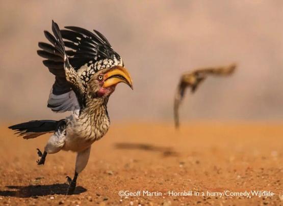 在南非齐曼加(Zimanga)的一处隐蔽拍摄点,摄影师Geoff Martin正在耐心等待他想要拍摄的主角——白背秃鹫。然而,白背秃鹫还没出现,一只南方黄嘴犀鸟却突然闯入镜头,稳稳停在前面,挡住了所有拍摄秃鹫的视线。这时,一只栗翅鹰从右侧迅速掠过,似乎把犀鸟吓了一跳,犀鸟便逃命般狂奔起来。