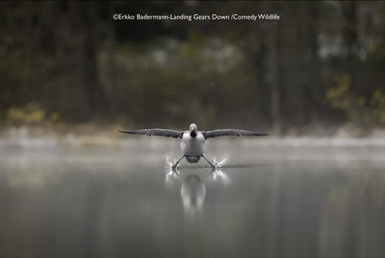 摄影师Erkko Badermann表示他拍摄红喉潜鸟已经好几年了,有时候会躺在池塘边缘的伪装网下,从隐蔽处拍摄它们春季的求偶表演。在一个雪雾交织的清晨,他拍到了这张飞鸟着陆的搞笑场景。