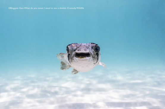 摄影师Bingqian Gao在加利福尼亚湾的浅水区发现了这只河豚。它的嘴一直张着,好像永远处于震惊状态。她后来意识到,这只河豚没法闭上嘴巴,是因为嘴里已经长出了一层厚厚的藻类。