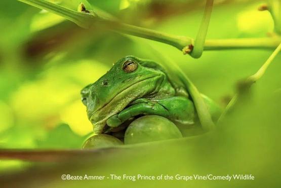 “青蛙王子”懒洋洋地趴在葡萄藤下,似乎把藤蔓和饱满的葡萄当成了自己的王宫。