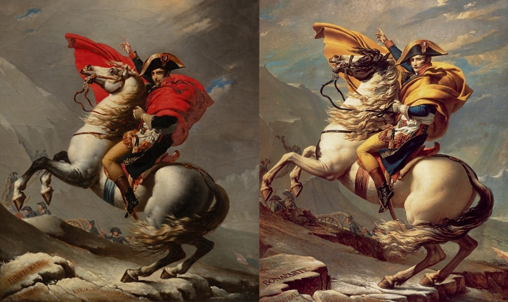 左:莫塞思《拿破仑翻阅阿尔卑斯山》,1807年,2025年在巴黎苏富比以原估值20倍的价格售出 图:Sotheby’s;右:雅克-路易•大卫《拿破仑翻阅阿尔卑斯山》,1801年,卢浮宫 藏