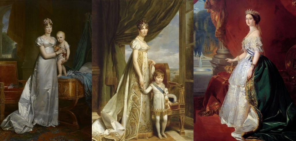 卢浮宫被盗珠宝的三位主人:玛丽-路易丝皇后(左),弗朗索瓦·热拉尔1807年绘;奥尔唐斯王后(中),弗朗索瓦·热拉尔1813年绘;欧仁妮皇后(右),温特哈尔特1853年绘