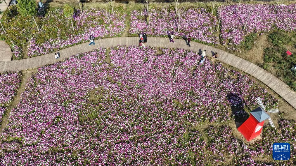 11月5日,游客在山东省东营市广饶县广饶街道七彩花海景区赏花(无人机照片)。