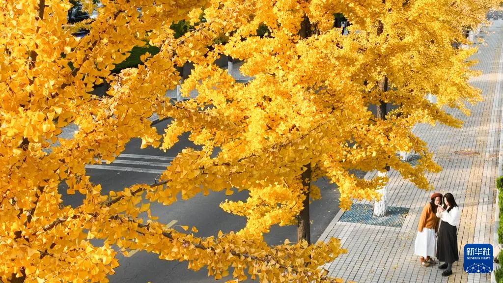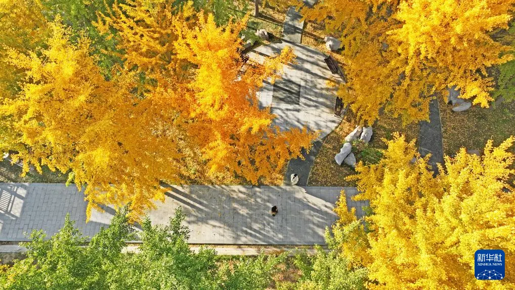 11月3日,市民在山东省邹平市城区观赏银杏(无人机照片)。