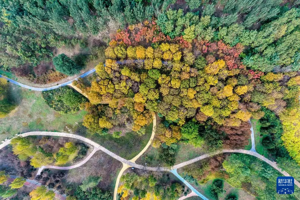 11月5日,在山东省青岛市城阳区棘洪滩街道,林木色彩交织、秋意正浓。