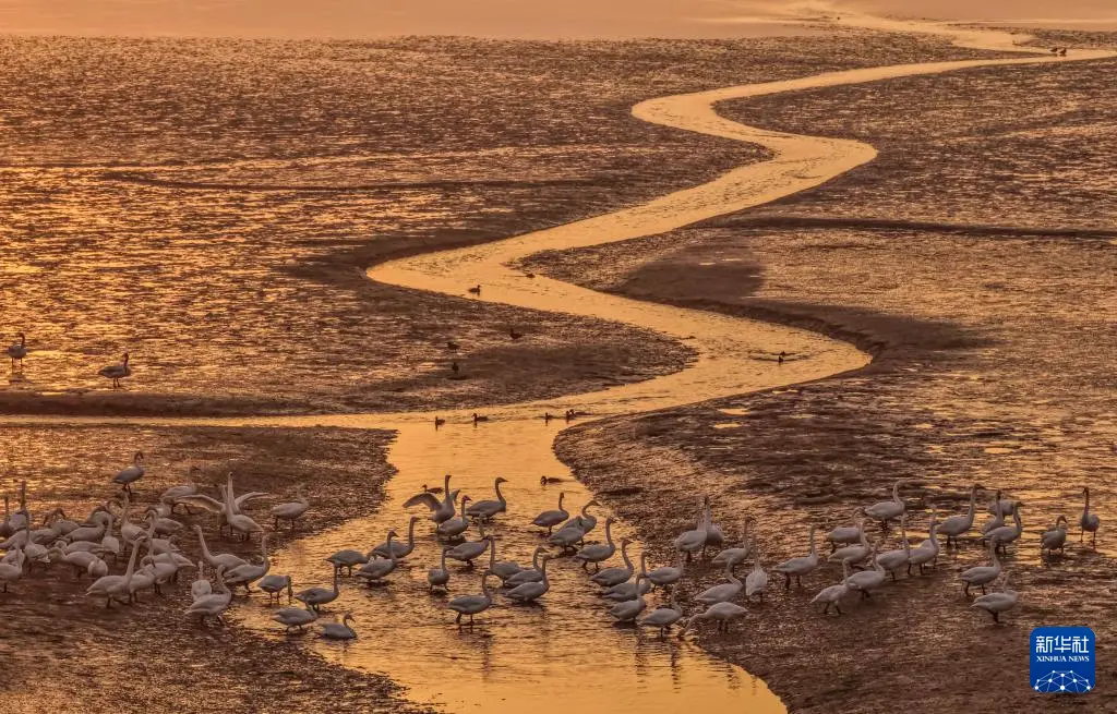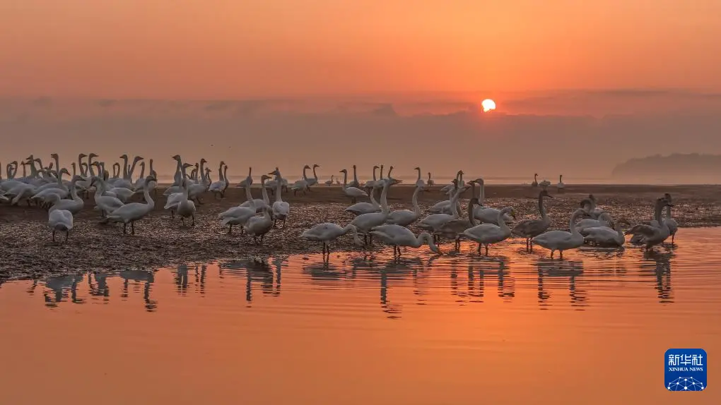 11月5日,在山东荣成市天鹅湖鸿鹄湾,越冬大天鹅在朝霞中栖息、觅食(无人机照片)。