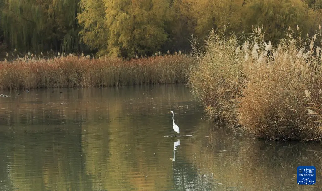 11月5日,一只白鹭在甘肃省张掖市国家湿地公园觅食。