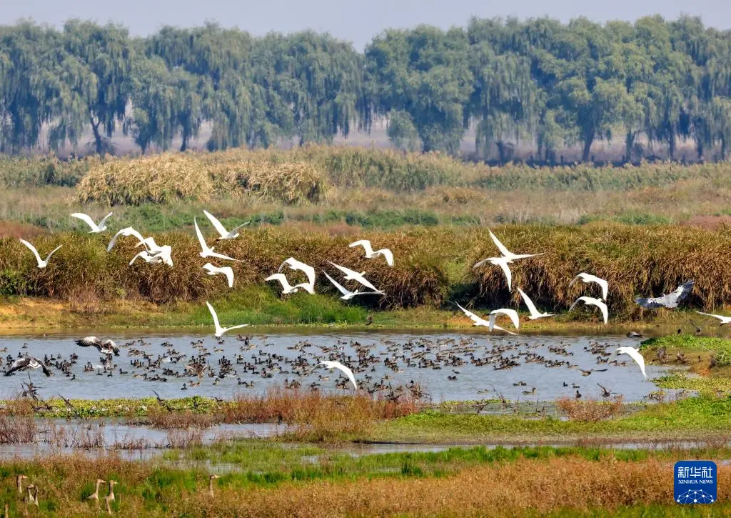 11月5日,在湖北省武汉市东西湖区府河湿地,群鸟自在翱翔。