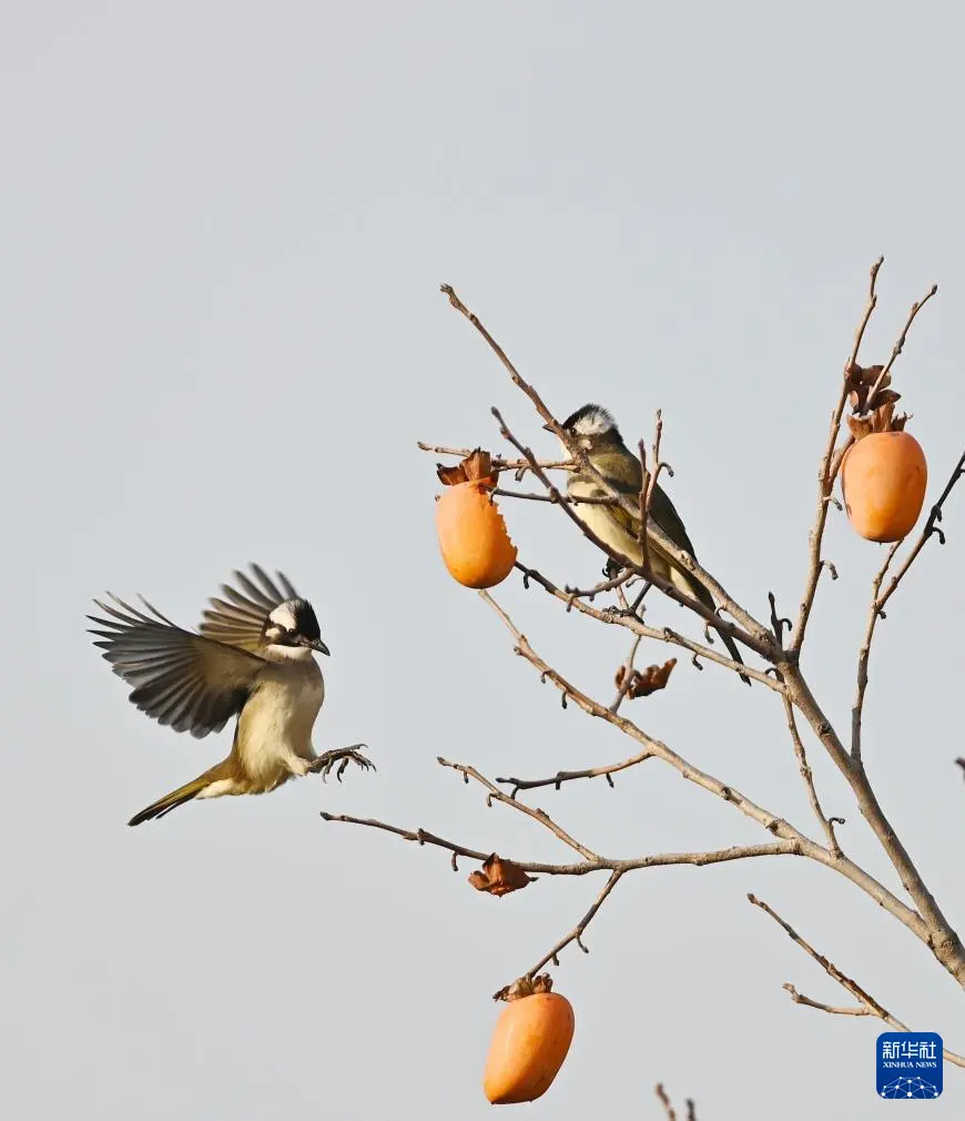 11月4日,山东省滕州市一公园的柿子熟了,吸引小鸟觅食、嬉戏。