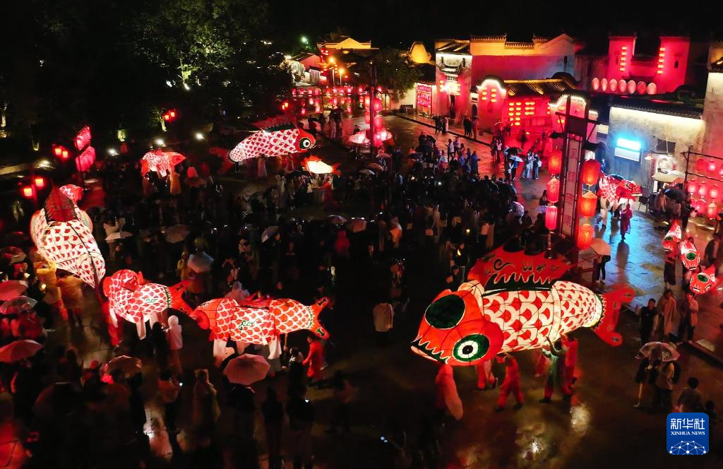 11月9日,一场别开生面的非遗鱼灯巡游活动在安徽省黄山市徽州区呈坎古村热闹上演,众多游客沉浸其间,在互动中感受传统民俗的魅力。