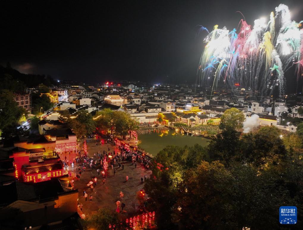 11月9日,在黄山市徽州区呈坎古村,村里的灯火与空中的烟花相映成趣(无人机照片)。