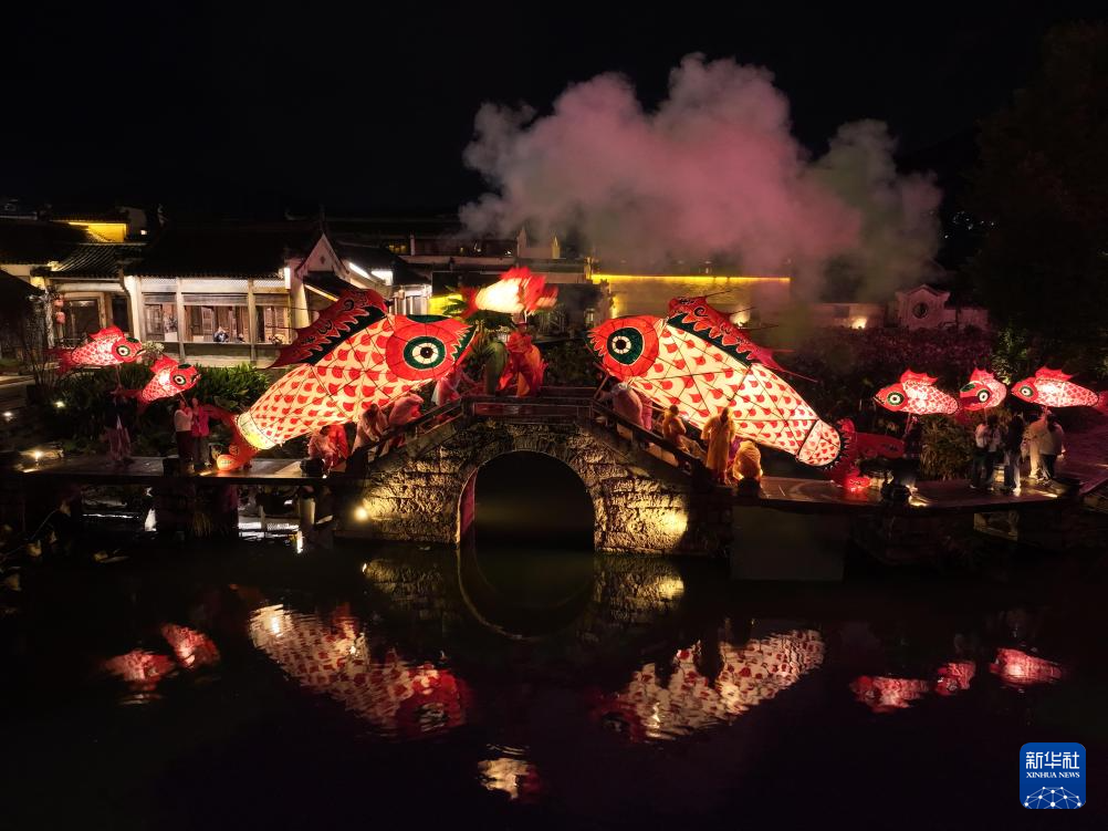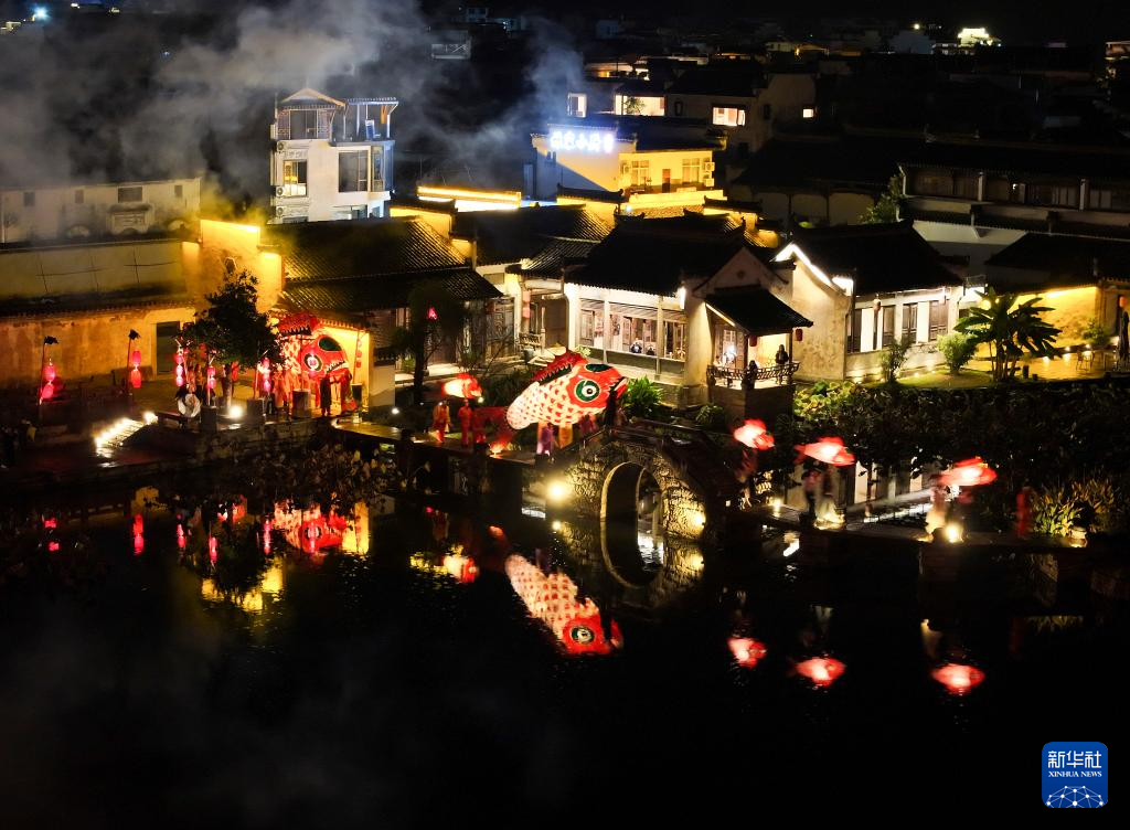 11月9日,游客在黄山市徽州区呈坎古村观赏鱼灯表演(无人机照片)。