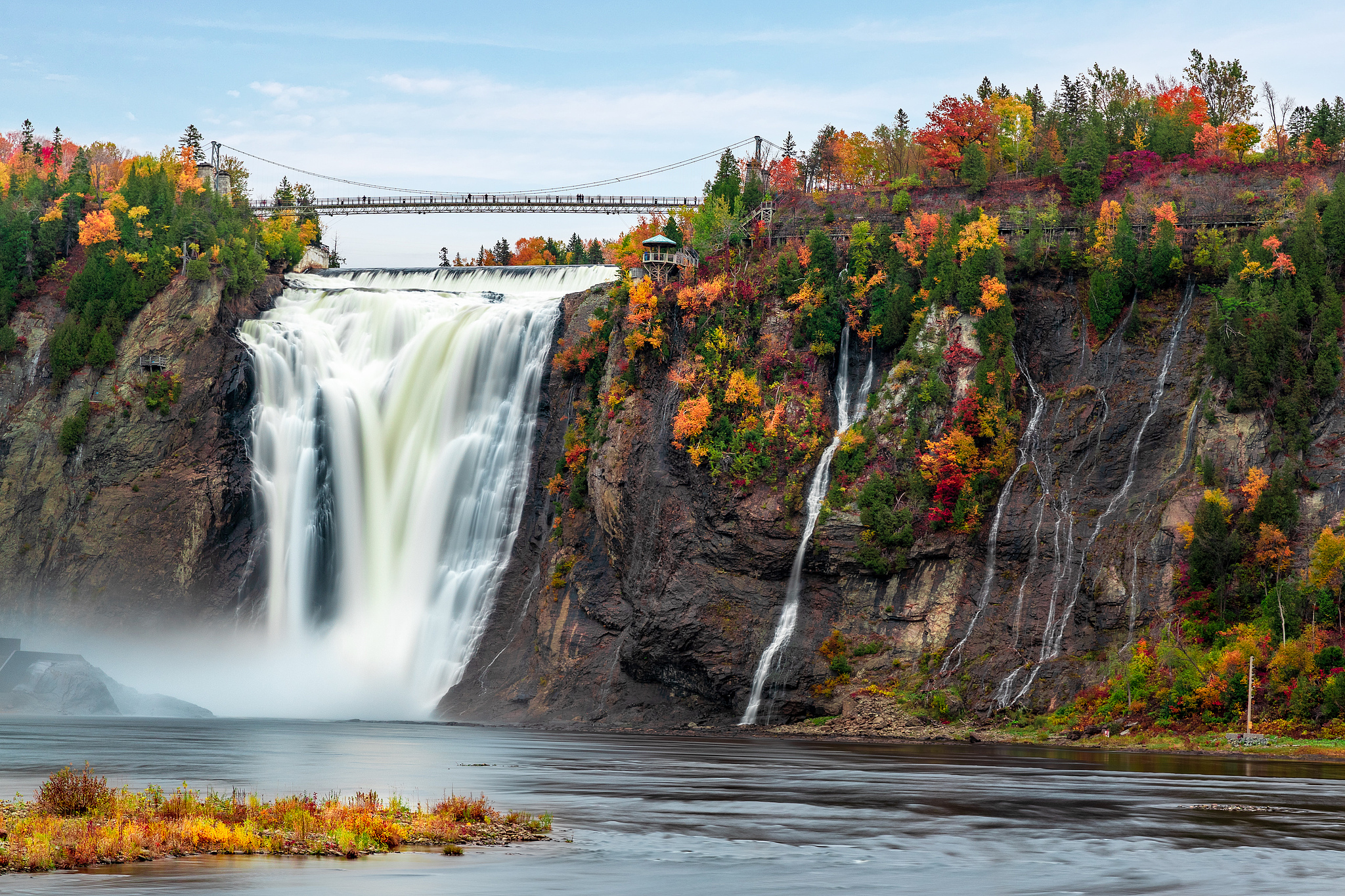 10月的圣安妮峡谷堪称是魁北克红叶天花板!三个吊桥俯瞰枫海,最出片的地点在第二座桥,拥有最天然柔光滤镜,建议穿防水鞋,清晨瀑布的水雾会打湿木栈道,站在桥上可以远眺整条圣劳伦斯河的美景。