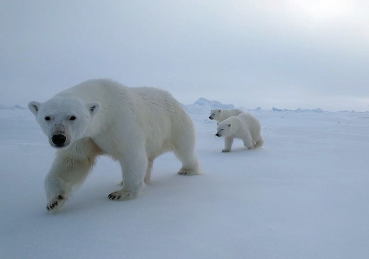 北冰洋高纬度地区的北极熊一家三口(2025年8月31日摄)。