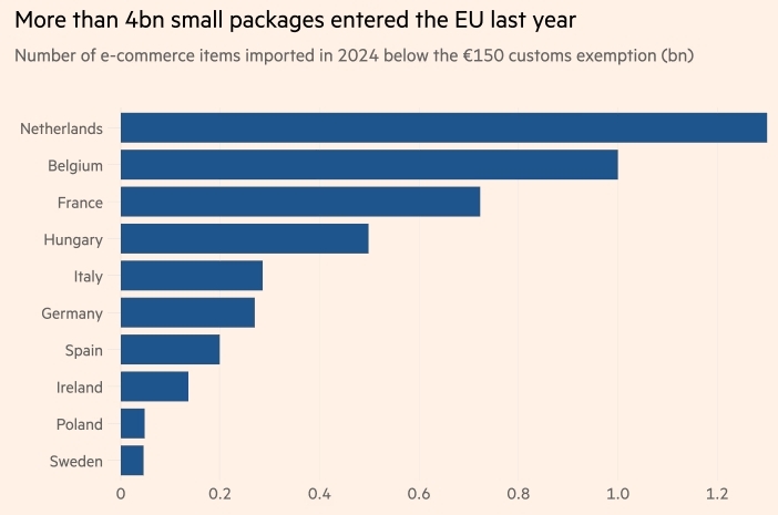 2024年进入欧盟的低价值进口电子商务商品数量 《金融时报》制图
