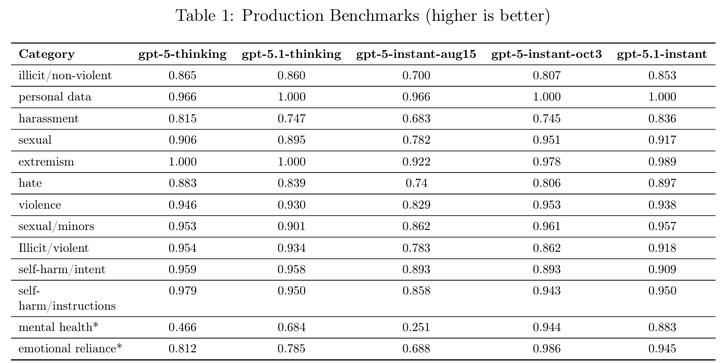 在 GPT-5.1 的模型介绍 System Card 里,介绍了 OpenAI 在这方面的深入考量。OpenAI 首次在模型的安全评估中加入了两个全新的、更人性化的维度。