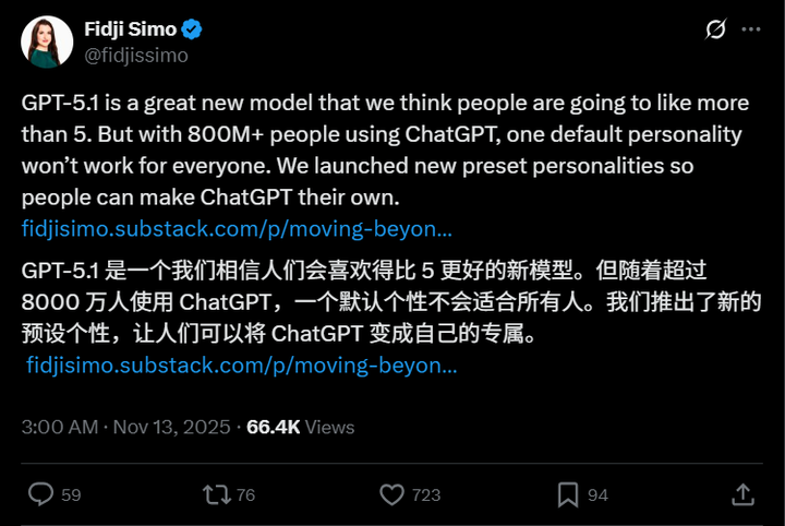 OpenAI 应用 CEO Fidji Simo 在她的文章中,有一个挺有意思的比喻,她说「如果我能完全控制我丈夫的特质,我可能会让他永远同意我,但很明显,这不是个好主意。」